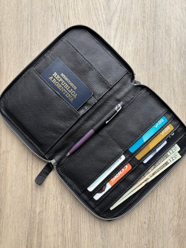 Incluye ranuras específicas para tarjetas de crédito/débito, billetes, lapicera, tarjeta de embarque y el espacio perfecto para tu pasaporte de viaje.